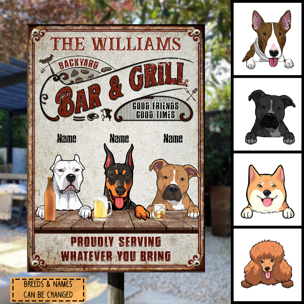 Backyard Bar & Grill, Good Friends Good Times, Proudly Serving What Ever You Bring, Personalized Dog Metal Sign