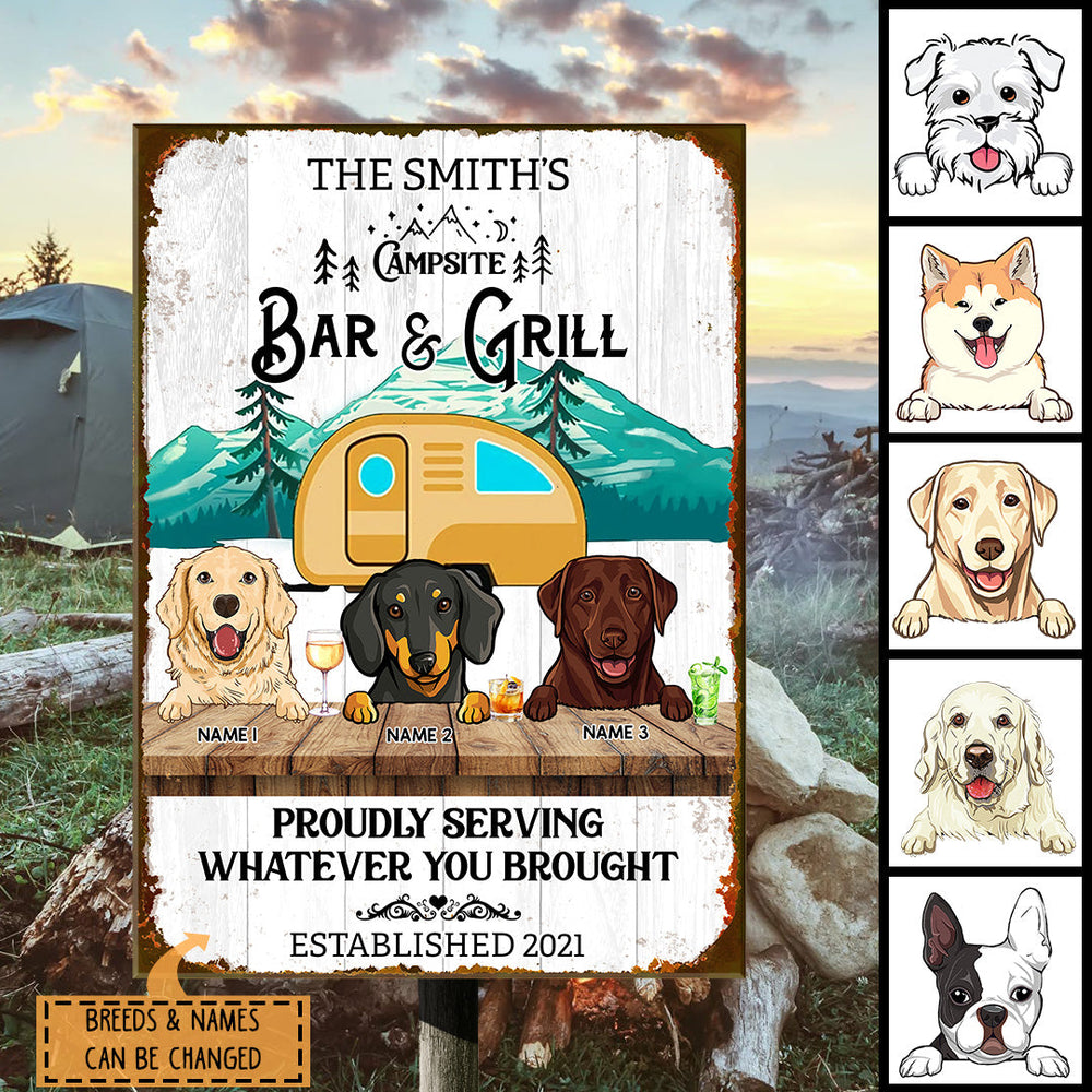 Campsite Bar & Grill Proudly Serving Whatever You Brought, Camping Sign, Personalized Dog Breeds Metal Sign