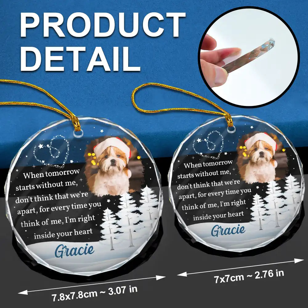 Honor the memory of a beloved pet with the Custom Photo When Tomorrow Starts Without Me Memorial - Personalized Glass Ornament. This unique and meaningful ornament is perfect for dog and cat lovers who want to keep their furry companions close to their hearts. With a space for a cherished photo, this heartfelt piece serves as a touching reminder of the joy and love pets bring to our lives.