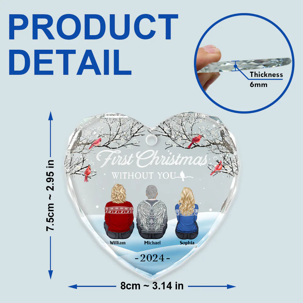 Honor the memory of loved ones with the Family Memorial First Christmas Without You - Personalized Heart Shaped Glass Ornament. This touching ornament serves as a heartfelt gift for grandparents, grandpa, grandma, family, parents, siblings, kids, daughters, and sons on Mother's Day, Father's Day, Thanksgiving, Christmas, birthdays, and anniversaries, capturing the essence of cherished moments that live on.