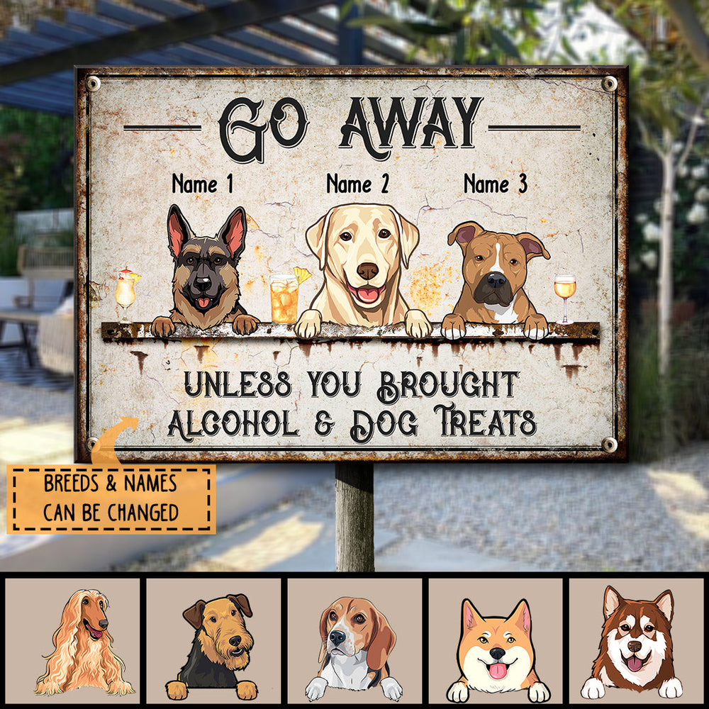 Go Away Unless You Brought Alcohol & Dog Treats, Dog & Beverage Sign, Personalized Dog Breeds Metal Sign