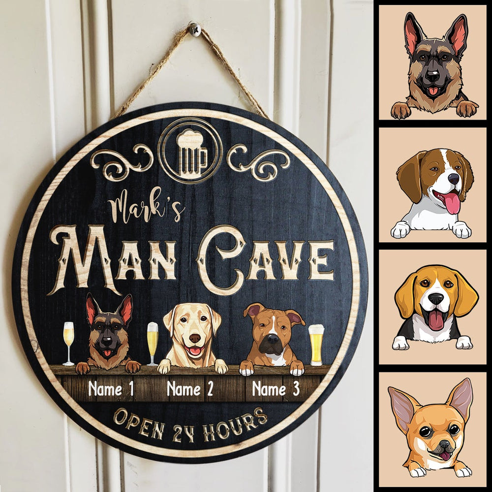 Man Cave Open 24 Hours, Black Background, Funny Gift For Dog Lovers, Personalized Dog Door Sign