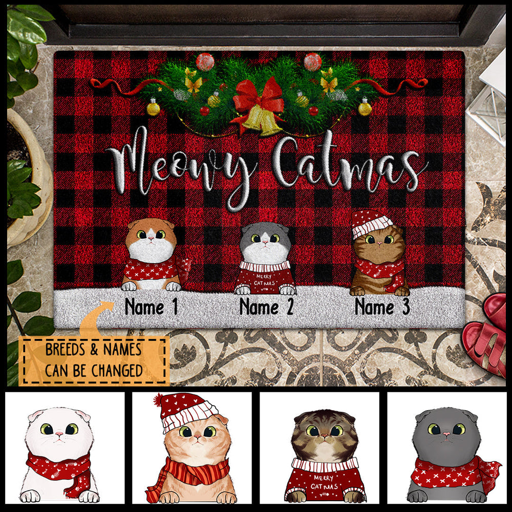 Merry Catmas, Dark Red & Black Plaid With Snow, Personalized Cat Lovers Christmas Doormat