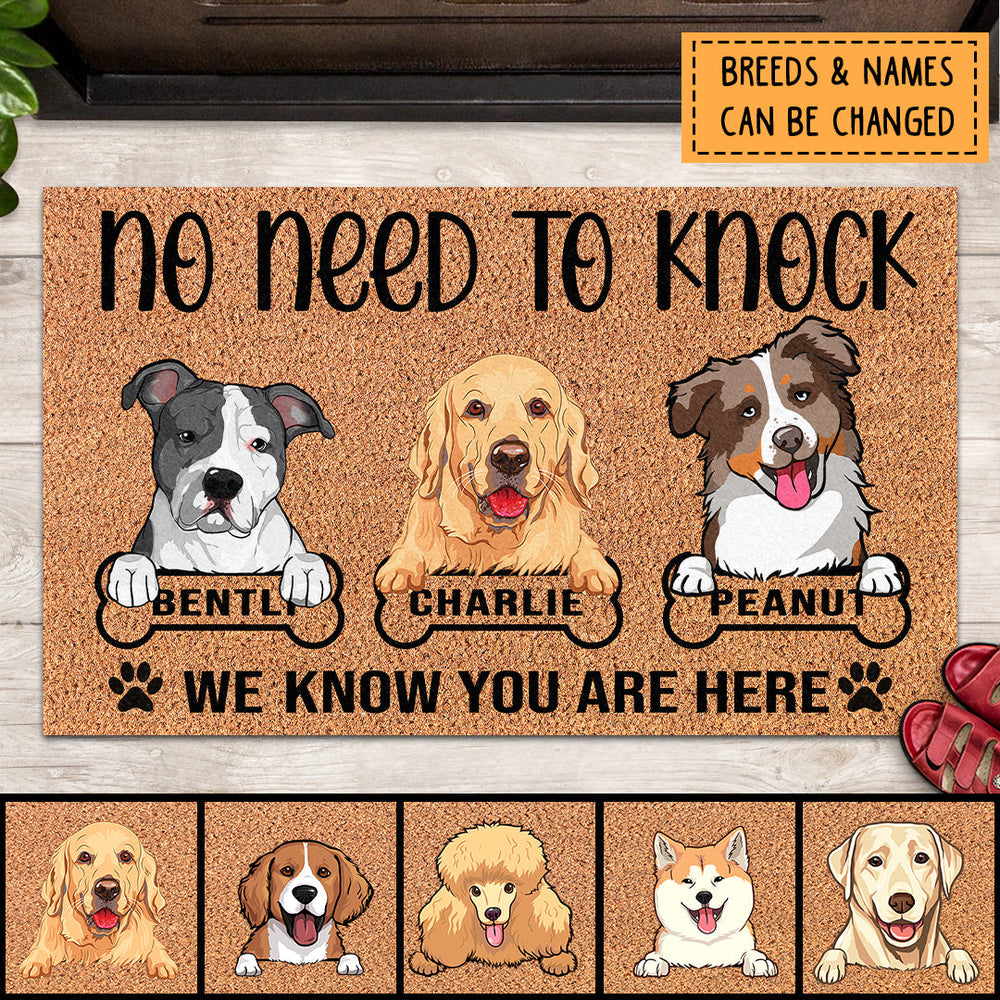 No Need To Knock, We Know You Are Here, Brown Background, Housewarming Gift, Personalized Dog Lovers Doormat