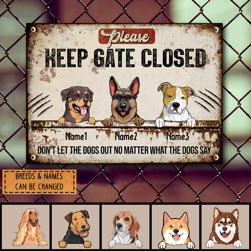 Please Keep Gate Closed Don't Let The Dogs Out, Personalized Dog Breeds Metal Sign, Gifts For Dog Lovers