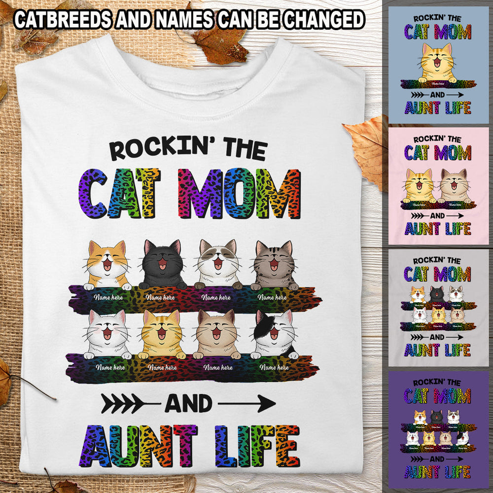 Rockin' The Cat Mom And Aunt Life - Rainbow Leopard Print - Personalized Cat T-shirt
