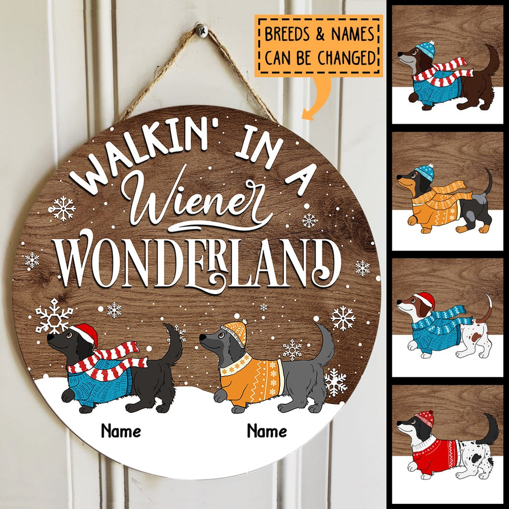 Walkin' In A Wiener Wonderland - Dachshund In Snow - Dark Pale Wooden - Personalized Dog Christmas Door Sign