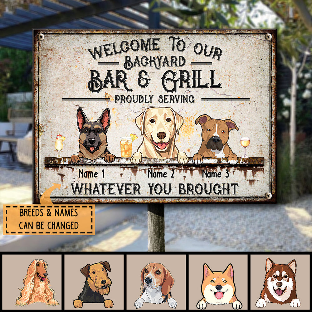 Welcome To Our Backyard Bar & Grill, Dog & Beverage Sign, Personalized Dog Breeds Metal Sign