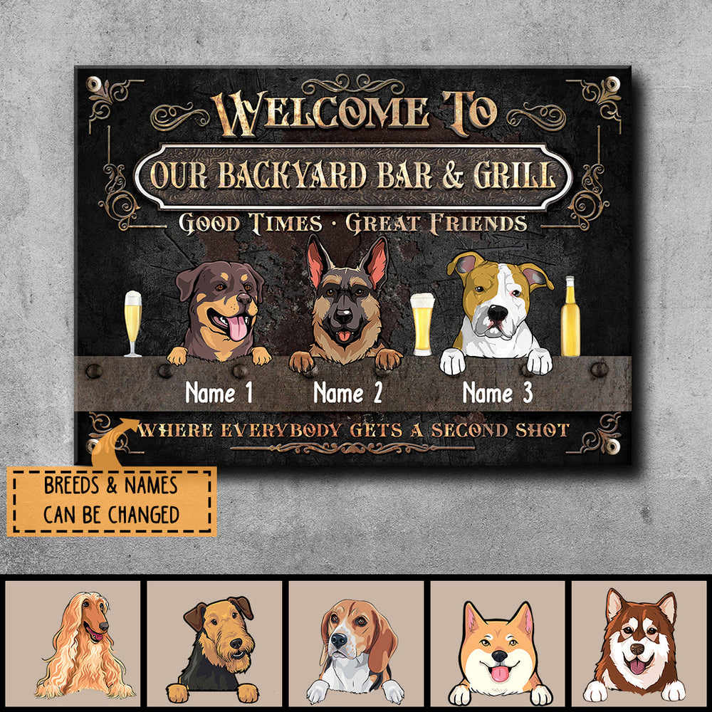 Welcome To Our Backyard Bar & Grill Where Everybody Gets A Second Shot, Personalized Dog Breeds Metal Sign