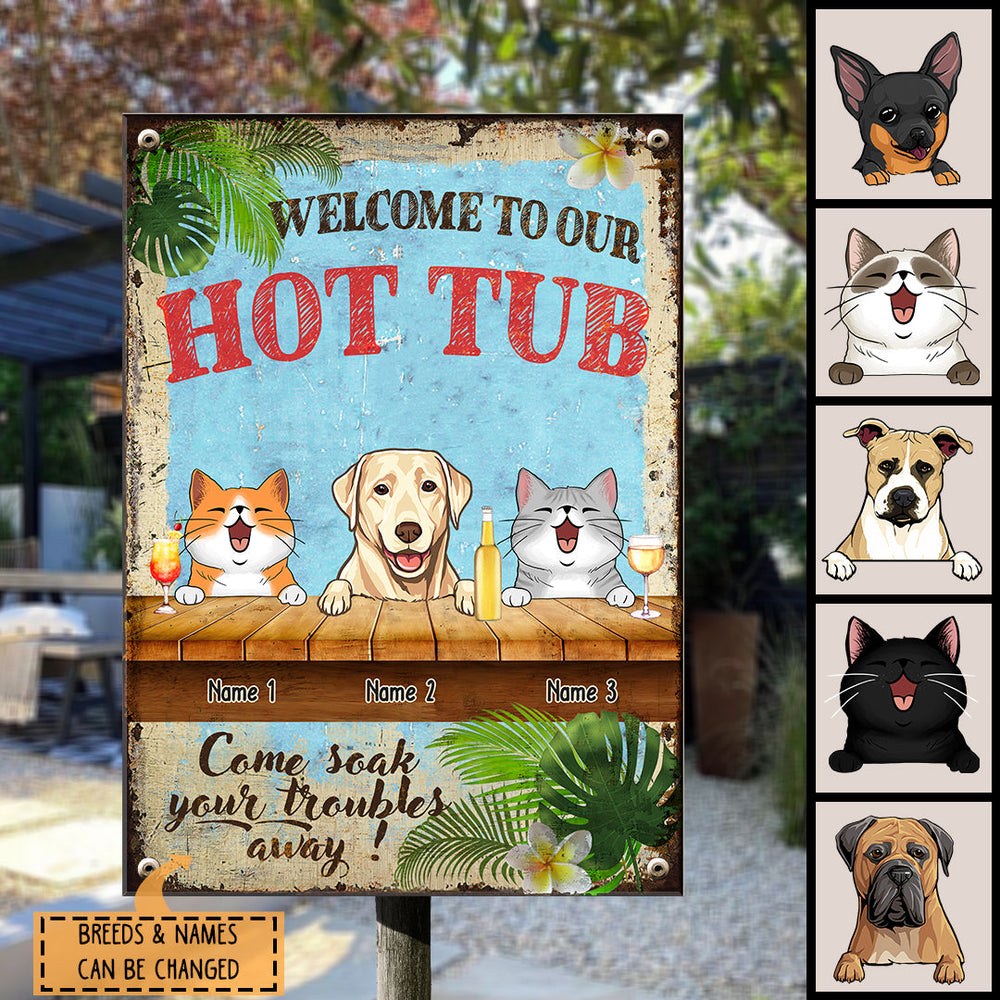 Welcome To Our Hot Tub, Hawaii Style Sign, Personalized Dog & Cat Metal Sign, Gifts For Pet Lovers, Outdoor Decor
